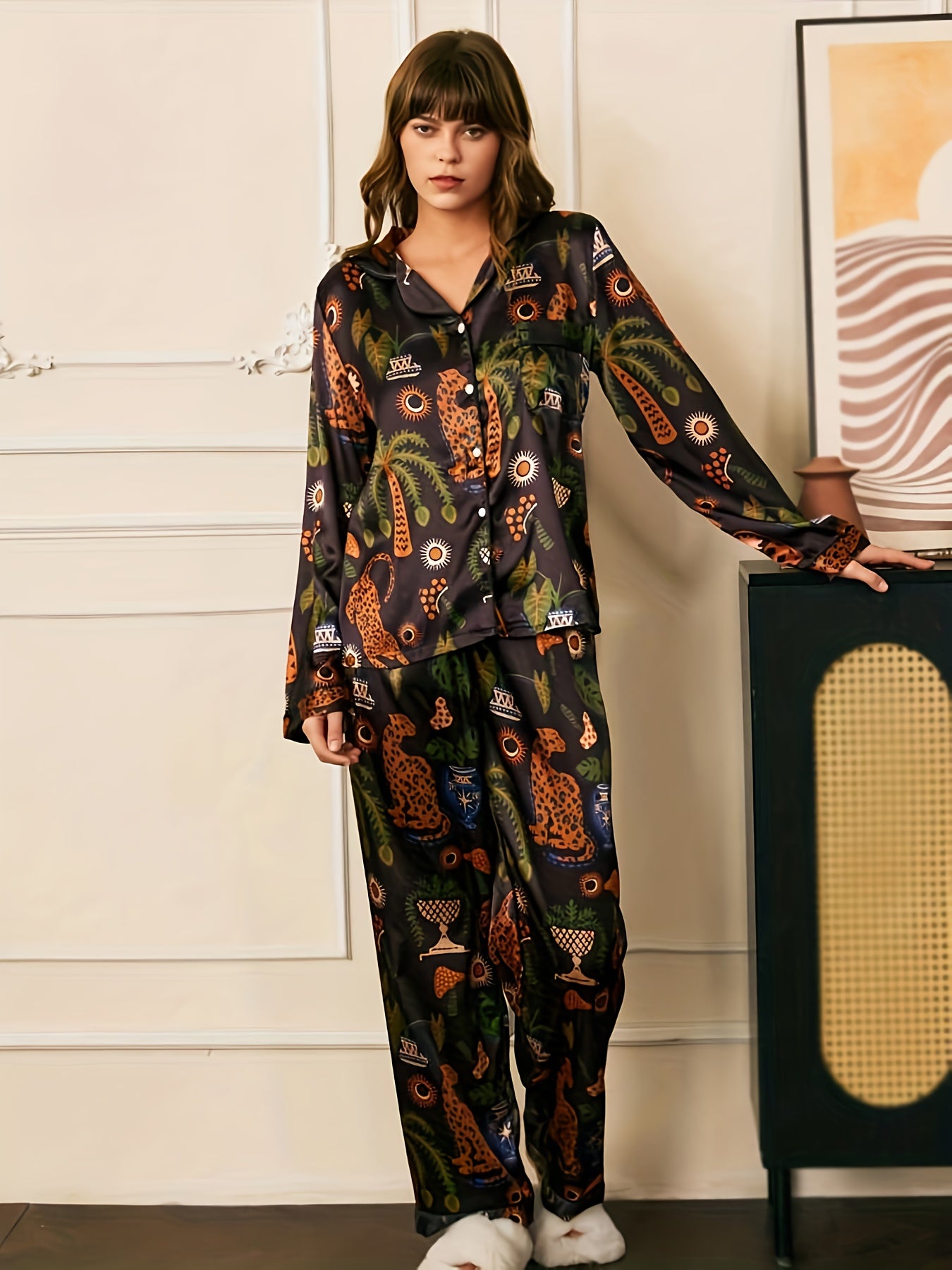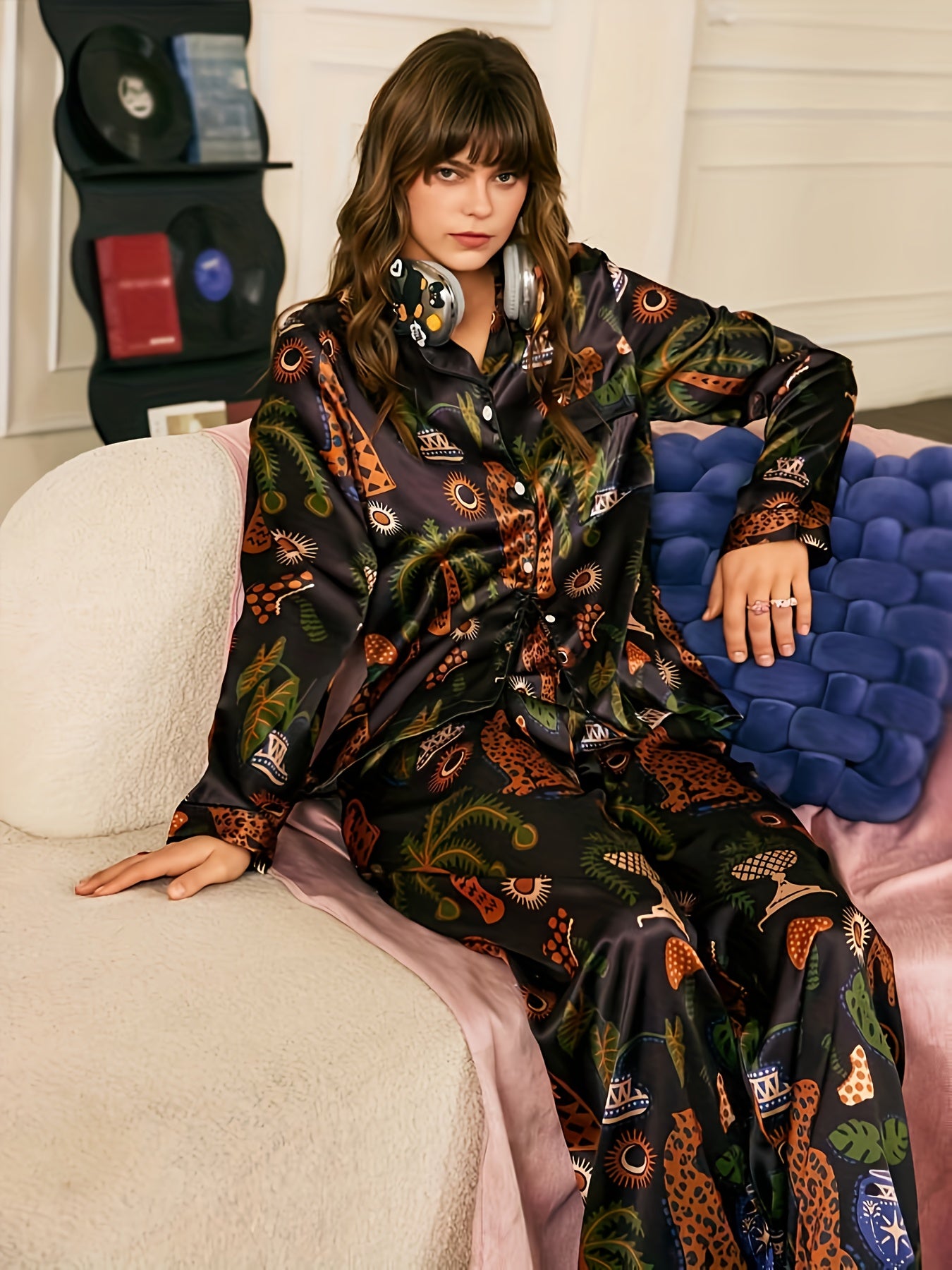 Step into effortless elegance with The Girls Club Midnight Panther Luxe Satin Pajama Set. Designed for the modern woman who adores bold aesthetics and luxurious comfort, this set features a rich midnight-black base adorned with artistic panther and jungle motifs — giving you the perfect blend of mystery, power, and style.