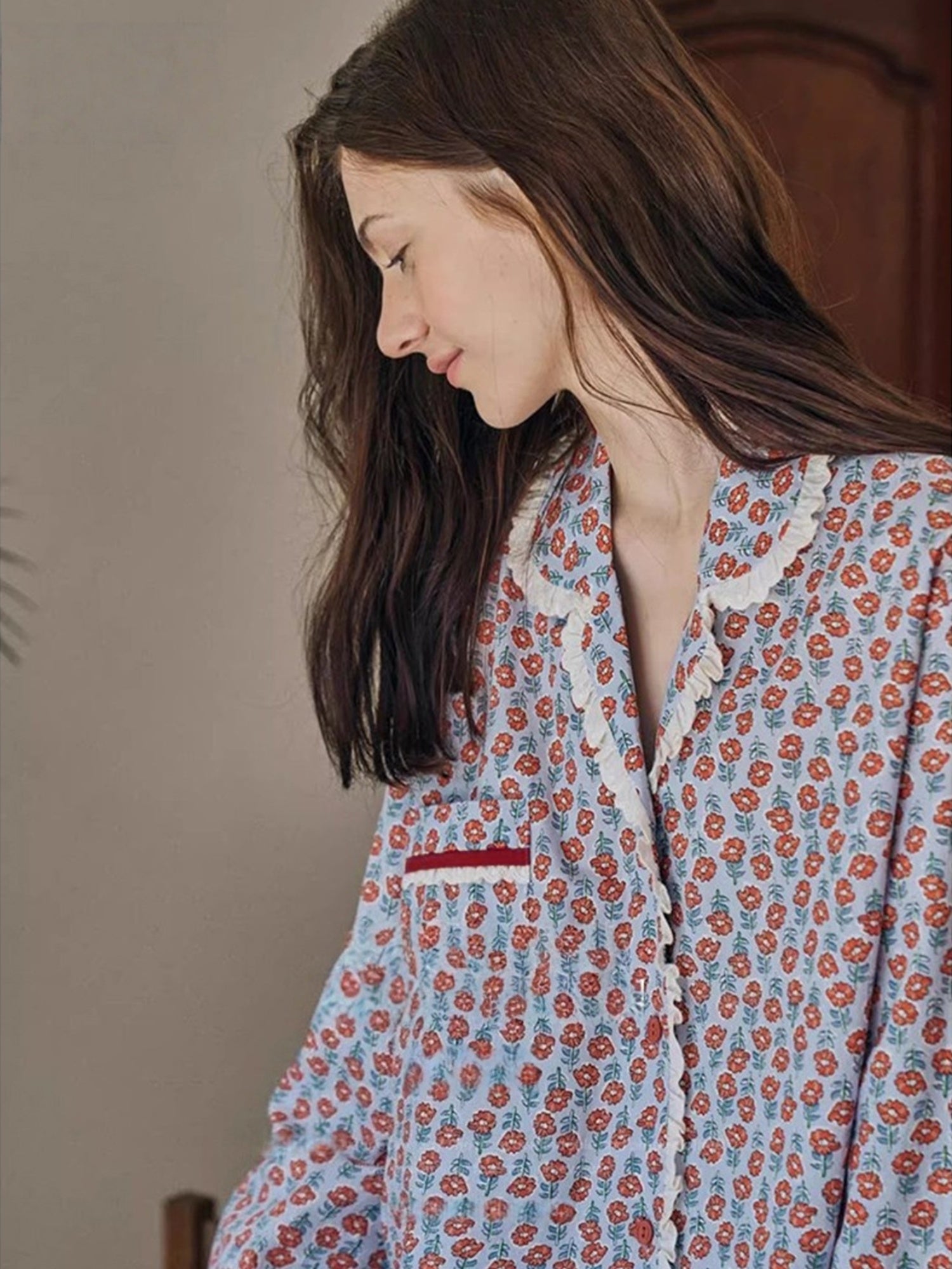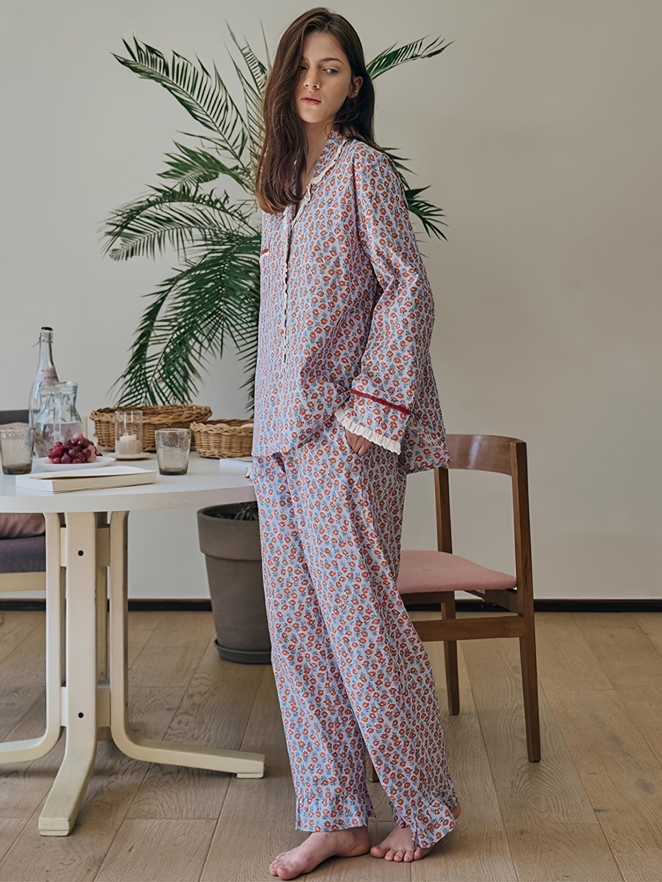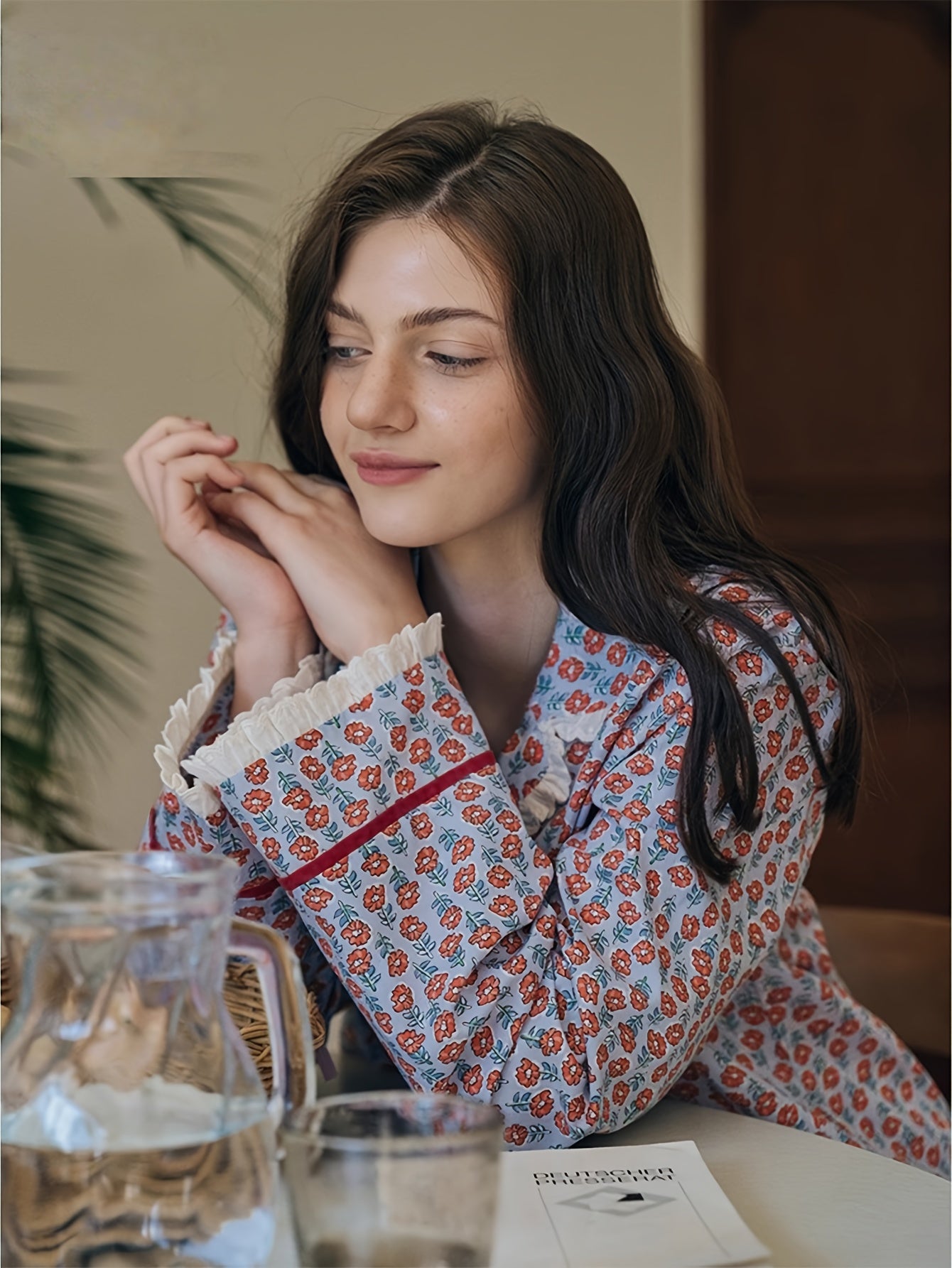 The delicate floral print adds a fresh, feminine touch, while the relaxed-fit shirt and pants ensure effortless movement through your day and night. Whether you're lounging, working from home, or unwinding before bed, this pajama set gives you unmatched comfort without compromising style.