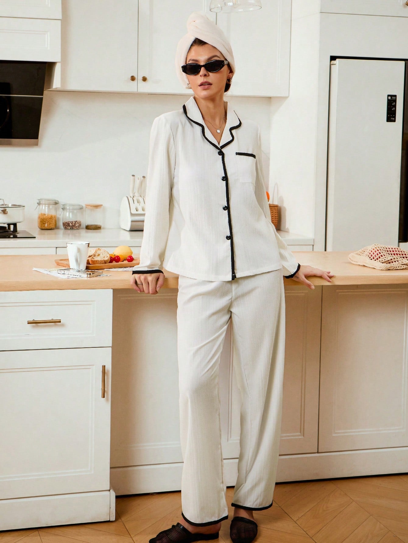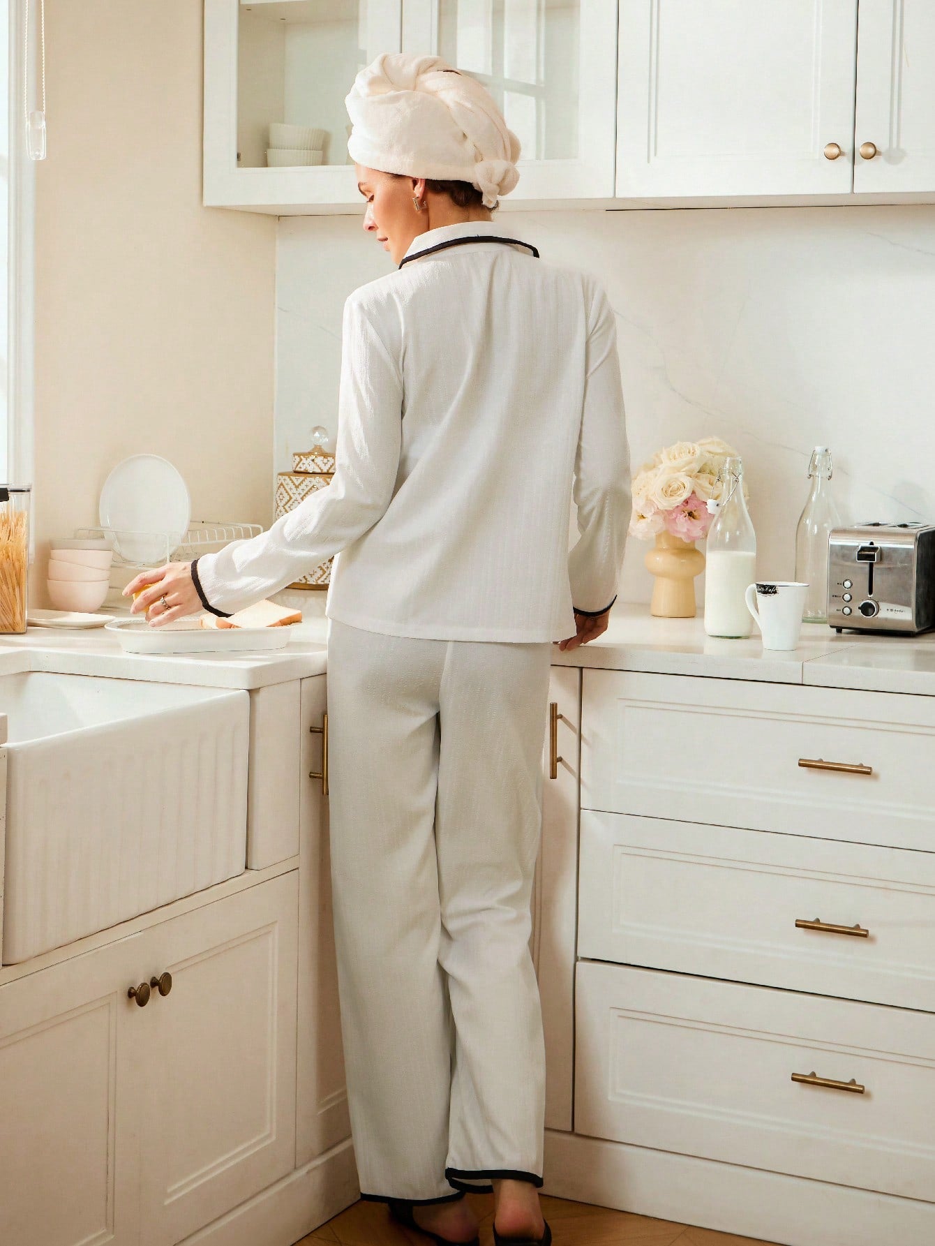 Step into timeless elegance with The Girls Club’s White Contrast Piping Pajama Set, crafted for women who love comfort wrapped in luxury. Made with soft, breathable fabric, this set features a classic button-down top with contrast black piping and matching straight-fit bottoms—perfect for cozy mornings, relaxing nights, and everything in between.